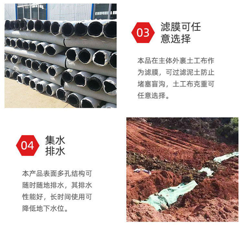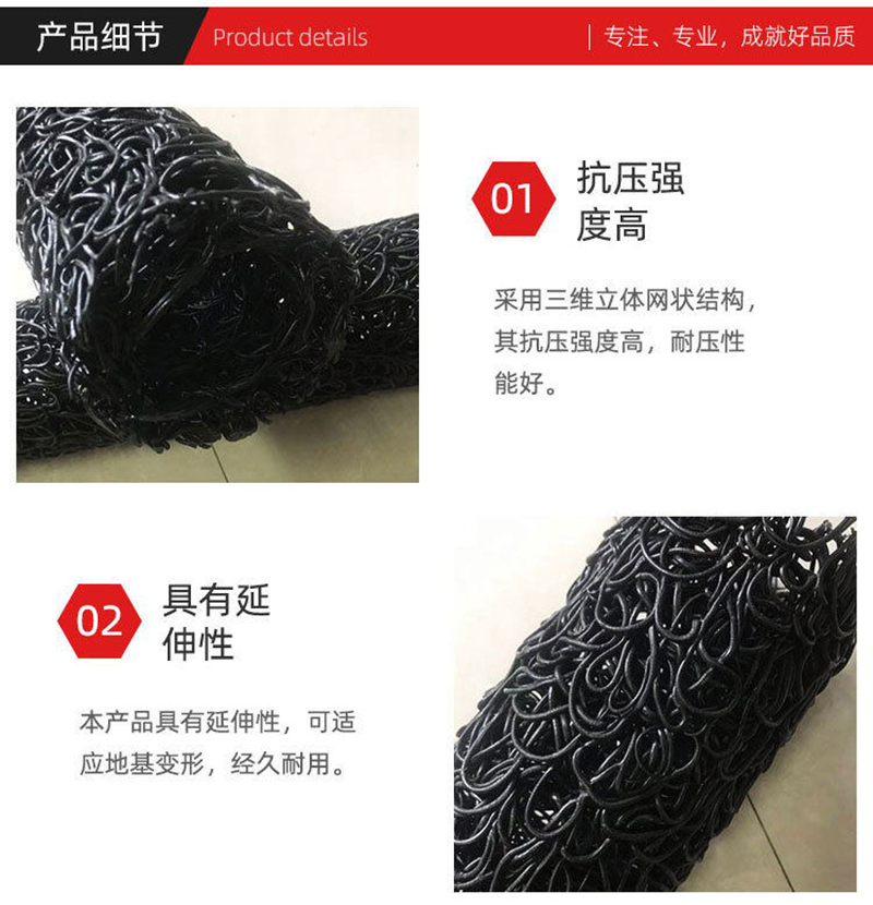 2、由于是立體結構,其空隙率為80-95%,構成空間與管理同且輕便,抗壓性能比管結構的樹脂強10倍以上,因此,即使因超負荷被壓,但由于是立體結構,故殘余空隙也達50%以上,不存在不通水的問題,無需考慮會被土壓力壓壞。