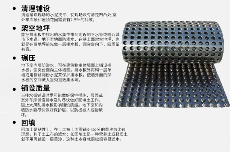 1、導(dǎo)水排水性。2、防水性能。3、排水板保護(hù)防護(hù)性。4、隔音及通風(fēng)防潮功能。